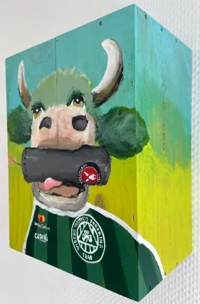 "Sjove" køer malet på træ-vinkasser. Men på en måde, så tryk og præg fra vinkassen er delvist bevaret, så man kan se, at det er en vinkasse. Se de nye kokasser...