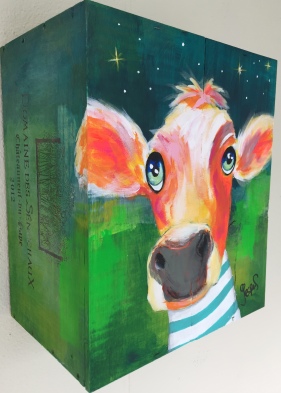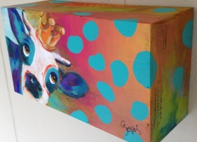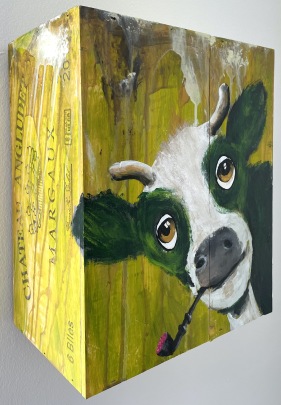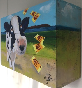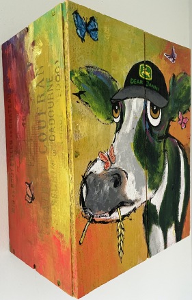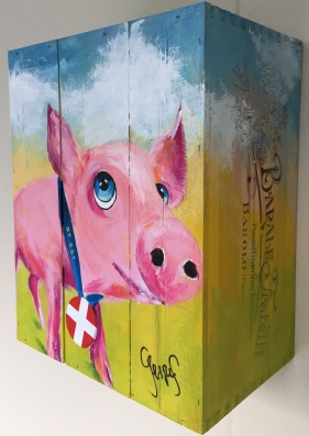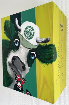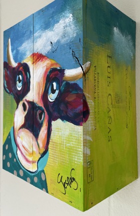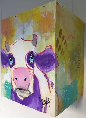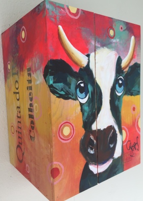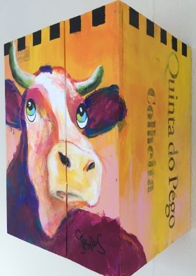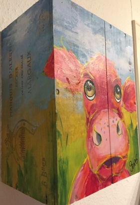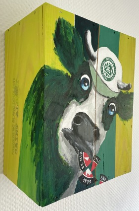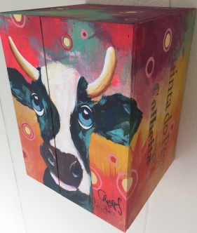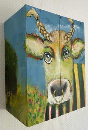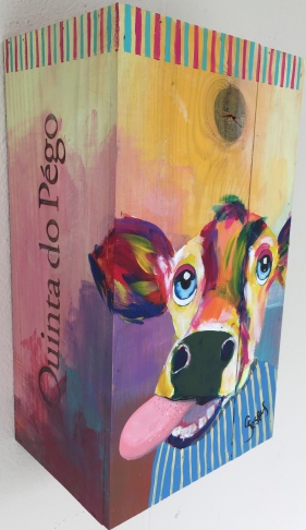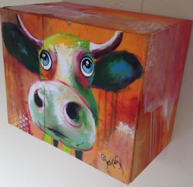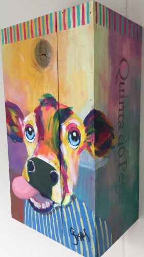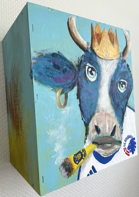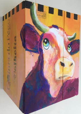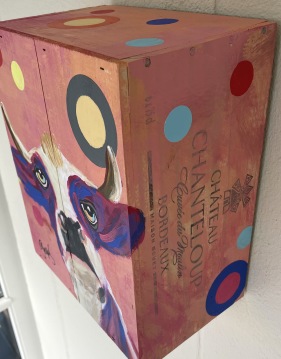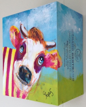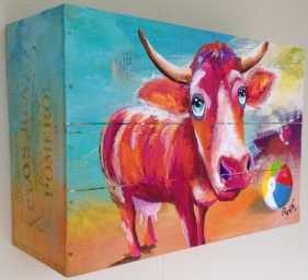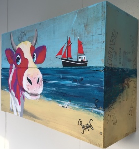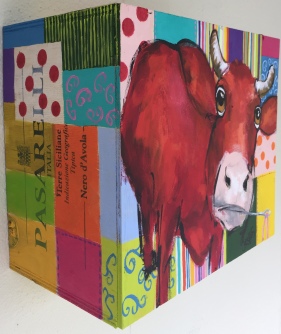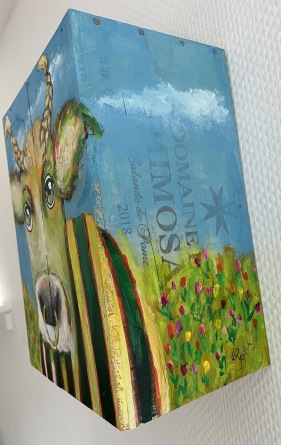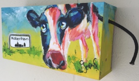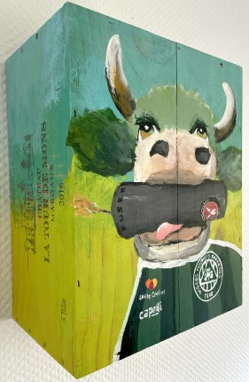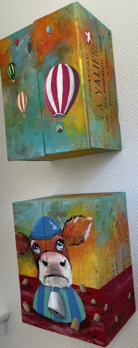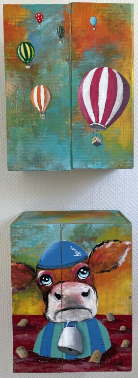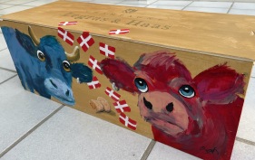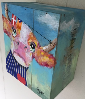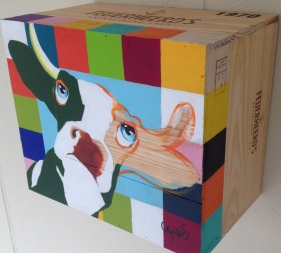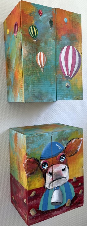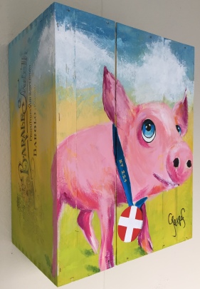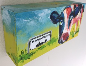 "Kokasser" er malet på træ-vinkasser, hvor jeg har bevaret tryk og præg osv. fra de originale kasser, men delvist malet over. Det giver en spændende effekt på væggen, at der er meget mere "dybde på maleriet". Nedenfor ser man hver kasse fotograferet fra begge sider samt fronten alene. Prisen er kr. 1.200,- pr. stk. Jeg maler også kokasser på bestilling, hvis du har et tema (kasserne 26, 27, 28 og 29 er lavet på den måde).